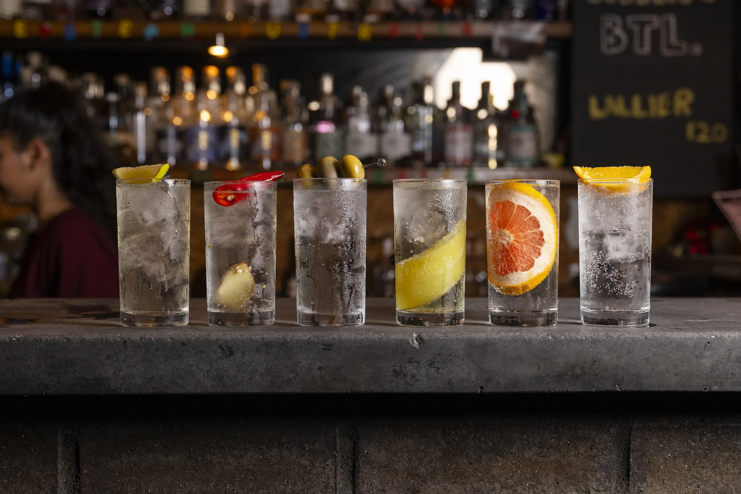 Six tall glasses filled with Gin and Tonic, each garnished with different slices or toppings of lemon, grapefruit, cherry, pickles, and orange, lined up on a bar counter with a well stocked bar background.
